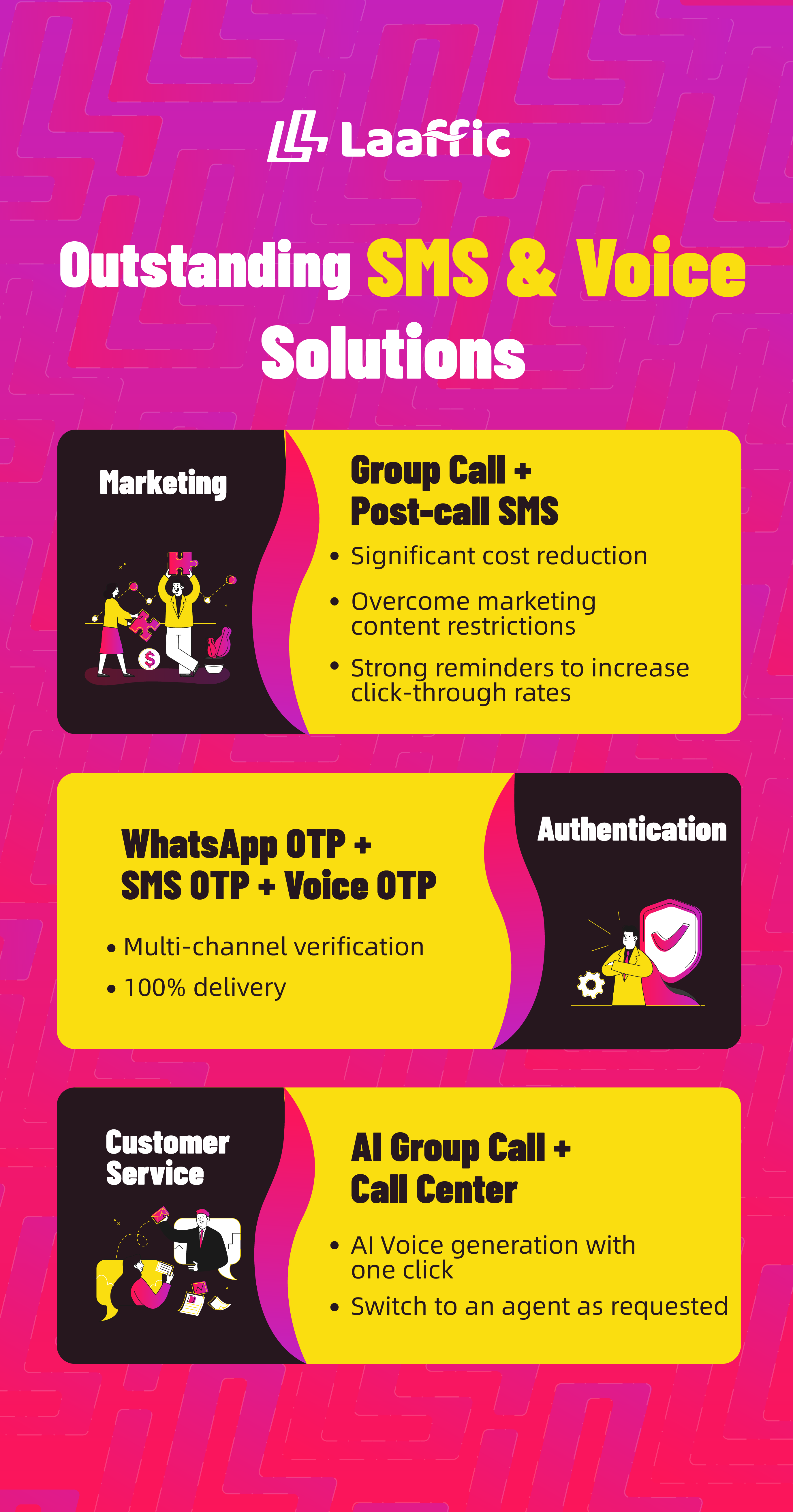 For verification scenarios, Laaffic offers multiple mainstream verification channels, including WhatsApp, SMS, and voice, allowing clients to choose or combine options to ensure high delivery rates and facilitate easy access and account management.
