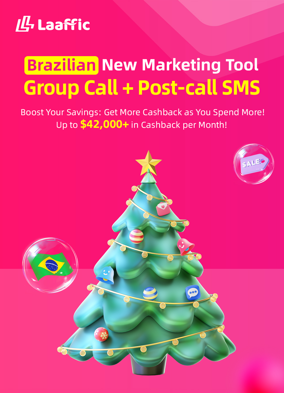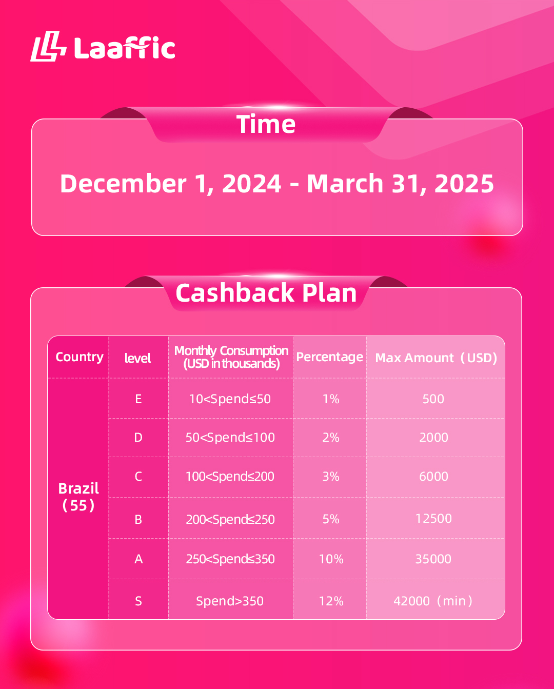 據統計,Laaffic某遊戲客戶在使用群呼+掛機短信後,巴西市場的單個獲客成本低至$4、轉化率提升20%、用戶活躍度提升41%。為幫助更多的客戶複製成功,Laaffic在今年的聖誕季還推出了返利活動,充值消費滿一定數額,即可獲得相應額度的現金獎勵。
