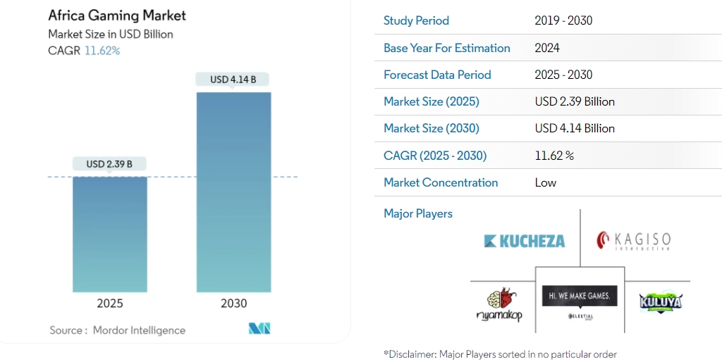據Mordor Intelligence機構預測,2025年非洲Gaming市場預計將達到23.9億美元,並有望在2030年達成41.4億美元成就,年復合增長率約為11.62%。