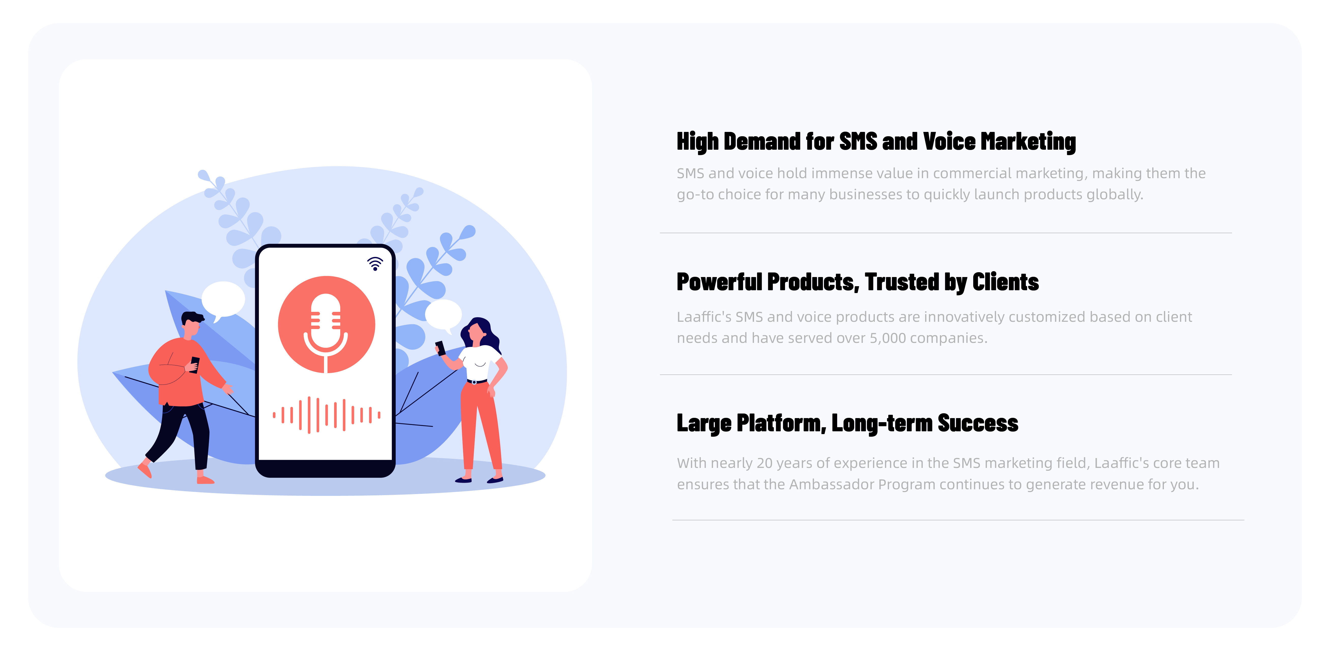 Laaffic innovates based on real customer needs, offering a flexible mix of SMS, MMS, voice broadcast, and two-way SMS. We have served over 5,000+ businesses globally and earned strong market trust.