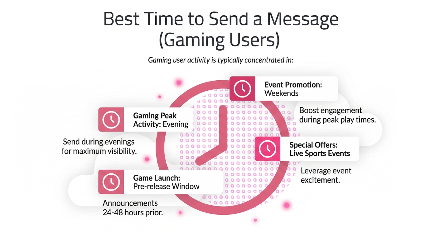 During sports events, like the upcoming World Cup, 30 minutes before the match, halftime, and 10 minutes after the match are the peaks of player attention. Sending SMS at these times maximizes benefits;