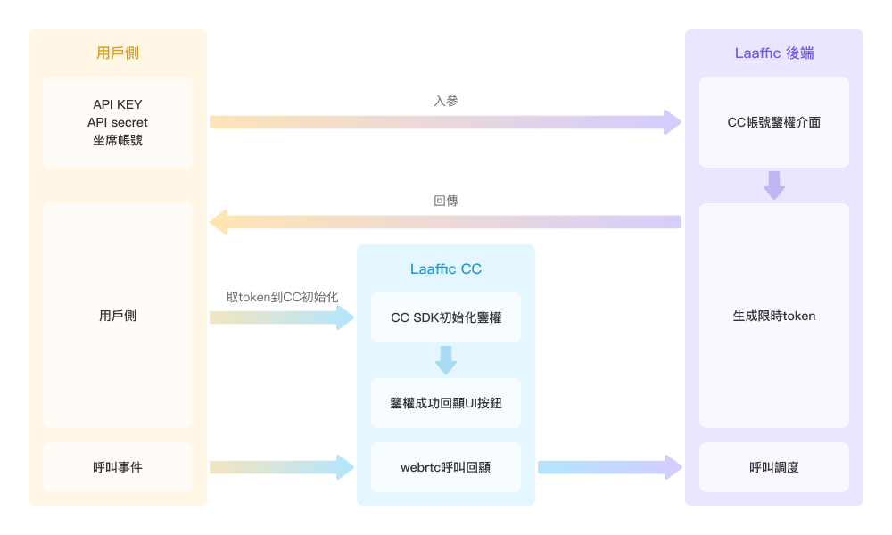 //1、為了保證鑒權資訊安全,需要由客戶系統後端服務實現SDK鑒權能力,並且將該介面暴露至客戶前端使用,客戶後端系統接入鑒權能力檔案可見( https://www.laaffic.com/zh/api/call/ccsdkAuthentication/ )